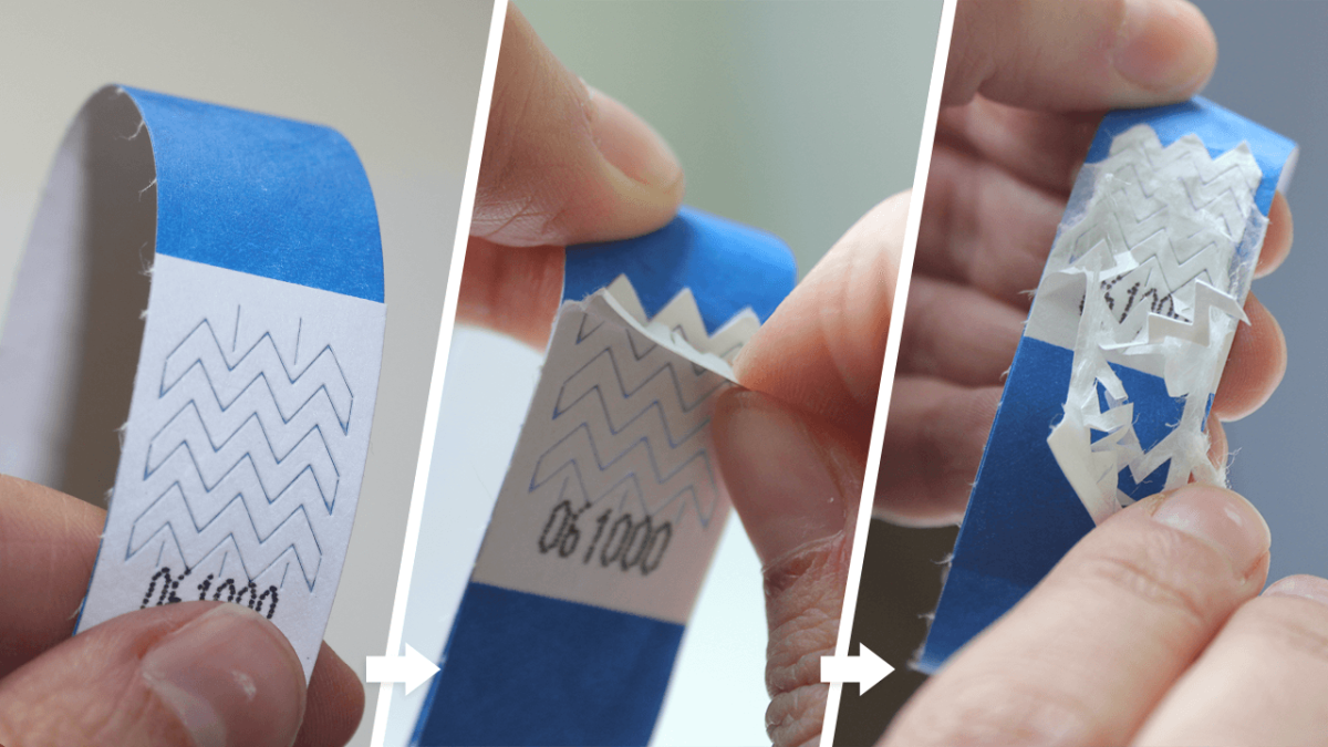 - Strong adhesive closure and unique tamper cuts cause wristbands to shred if tampered with
