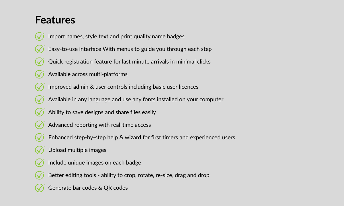 - Say goodbye to scruffy hand-written badges with onsite printer for last minute arrivals